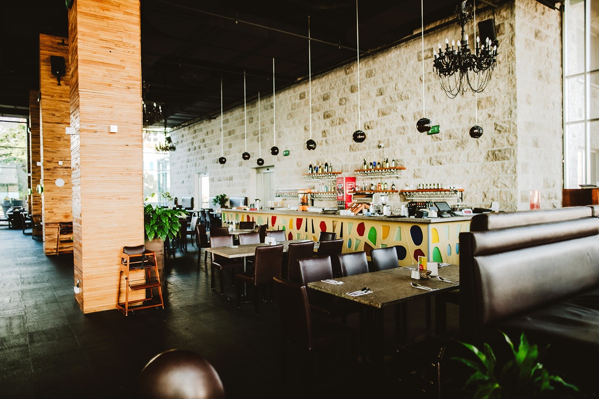 Ethnic art pieces, grey stone floors, custom lighting, and a refined mix of textures and materials create a warm and inviting ambience at Restaurant Bruno throughout the day.