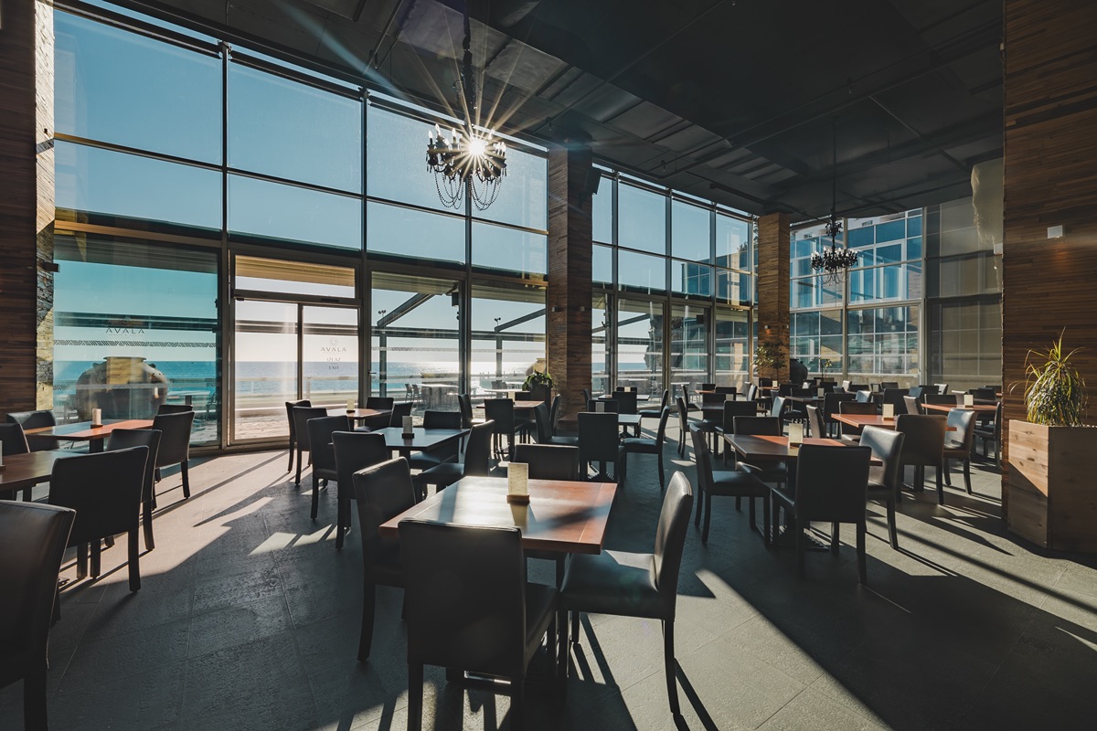 The restaurant features a combination of elegant dining seating and communal tables, as well as a spacious terrace overlooking the Old Town landmark and the sea horizon.
