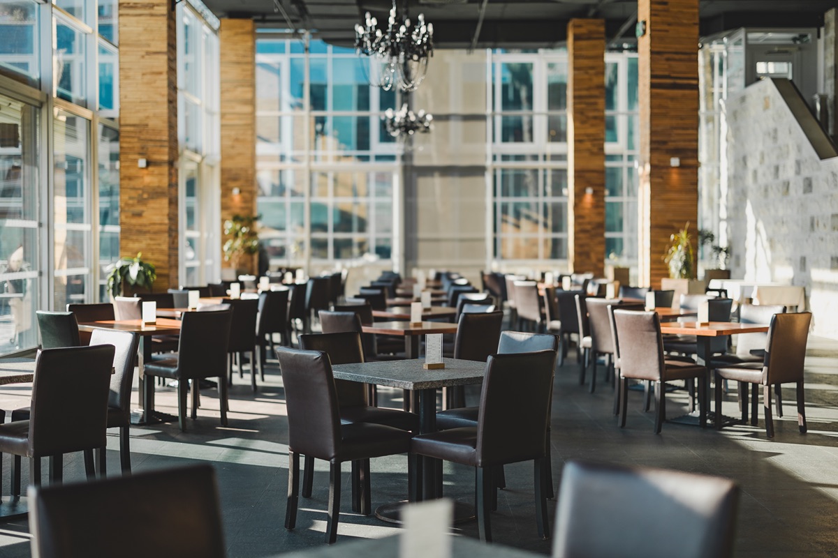 Ethnic art pieces, grey stone floors, custom lighting, and a refined mix of textures and materials create a warm and inviting ambience at Restaurant Bruno throughout the day.